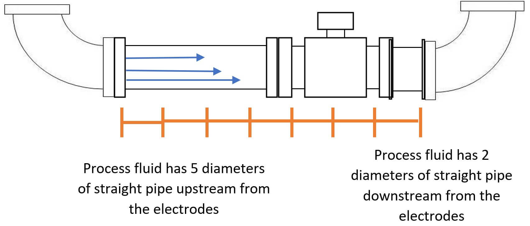 When installing a magnetic flow meter, an upstream and downstream straight run is specified by the manufacturer. An industry standard is five pipe diameters (upstream) from the inlet and two pipe diameters (downstream) from the outlet, as depicted in the figure below.